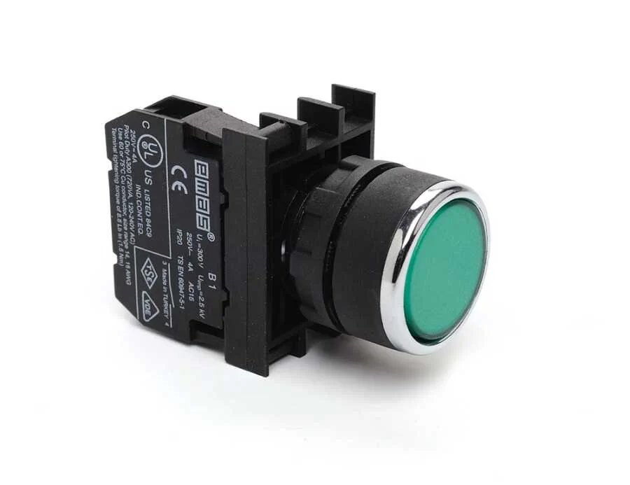 Emas B100DY Plastik 1NO Yaylı Düz Yeşil 22 mm Buton